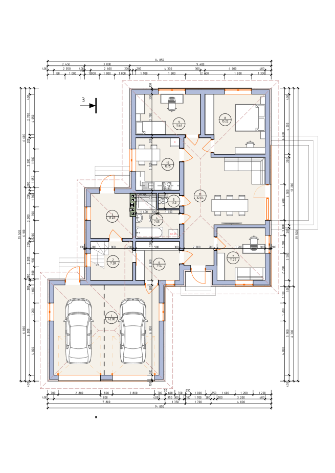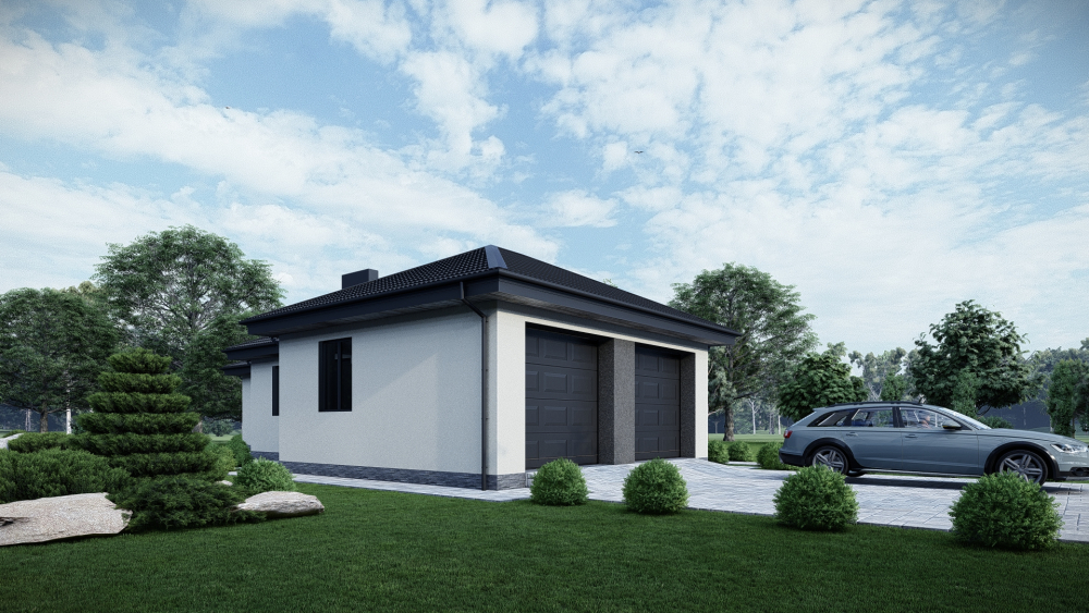Просторий одноповерховий будинок з багатосхилим дахом, який завдяки своїй Г-подібній формі створює затишний внутрішній дворик. Фасад оздоблений світлою штукатуркою з вставками із темно-сірої декоративної цегли. Планування відзначається високою функціональністю: простора вітальня, три спальні, великий гараж на два автомобілі забезпечують максимальний комфорт для великої родини.