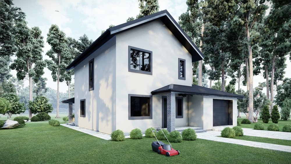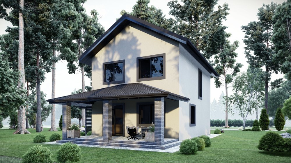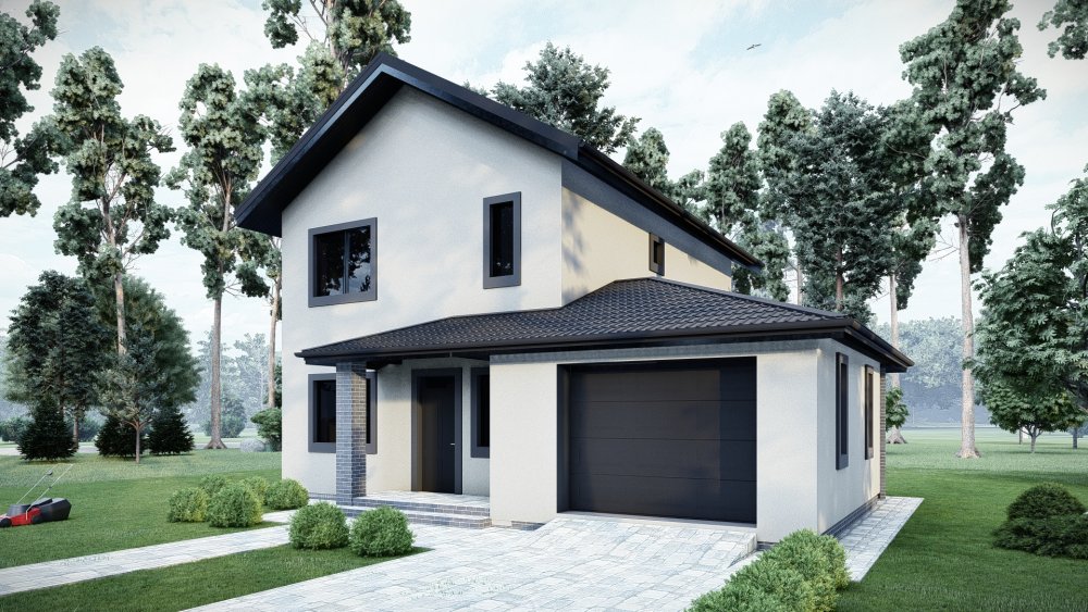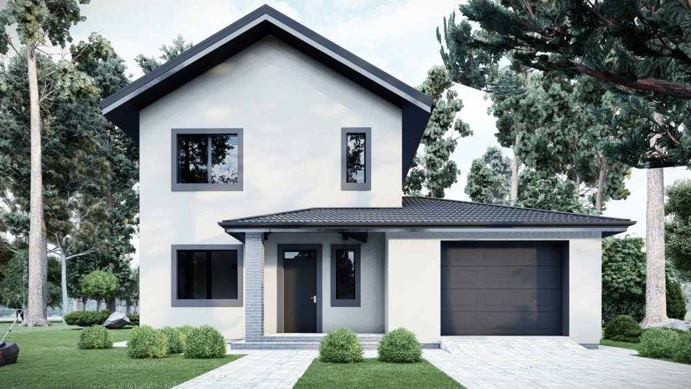 Компактний та затишний двоповерховий будинок у класичному стилі з двосхилим дахом. Фасад оздоблений світлою штукатуркою з акцентними вставками із темної клінкерної цегли, що надає будівлі сучасного та охайного вигляду.