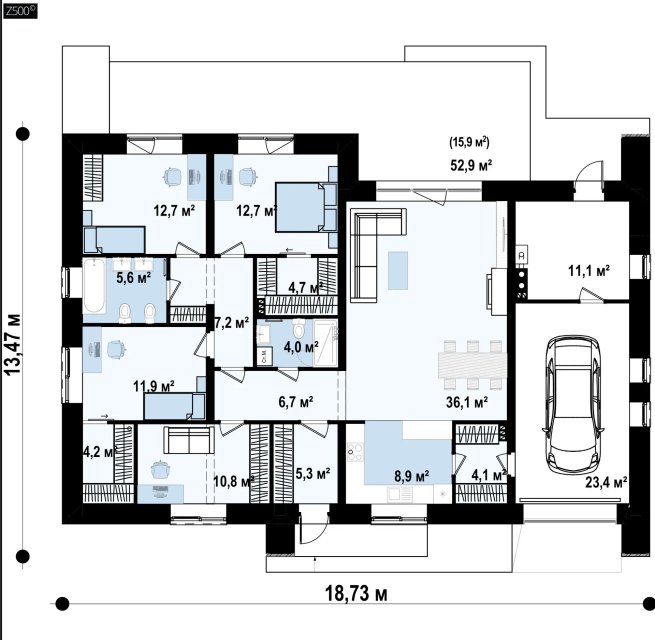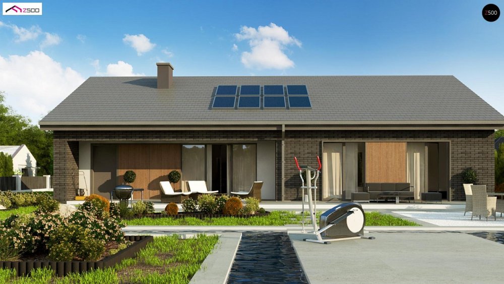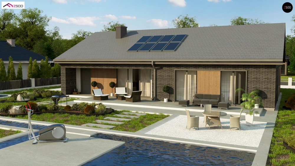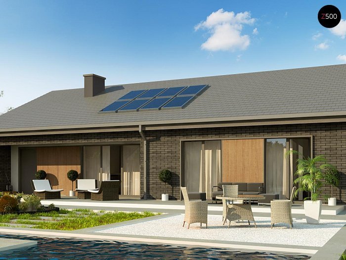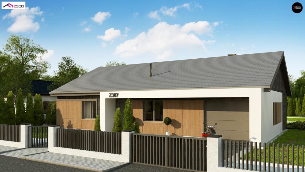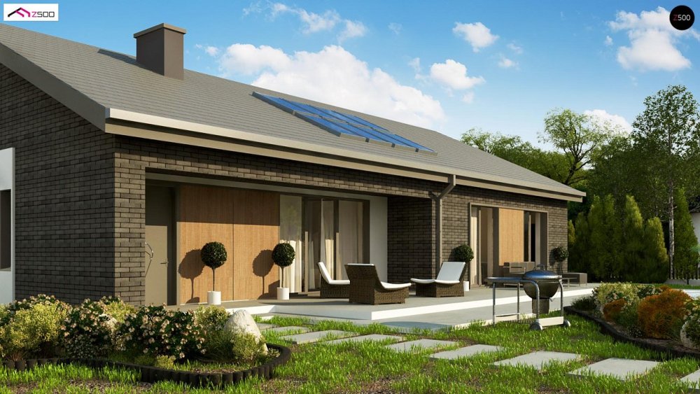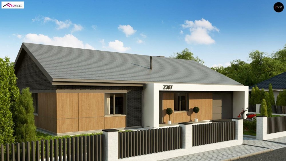 Вариант одноэтажного дома Z387 с фасадом облицованным кирпичом