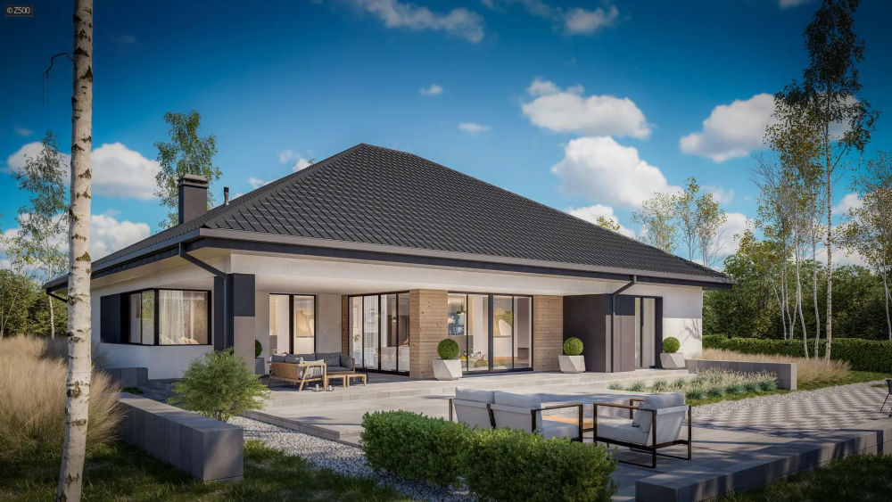 U412 30+ — це стильний одноповерховий будинок, створений для тих, хто цінує простір, світло та практичність. Архітектура поєднує елементи мінімалізму та сучасного дизайну: чіткі форми, великі вікна, натуральні матеріали та спокійна палітра кольорів на фасаді створюють витончену, але водночас затишну атмосферу.