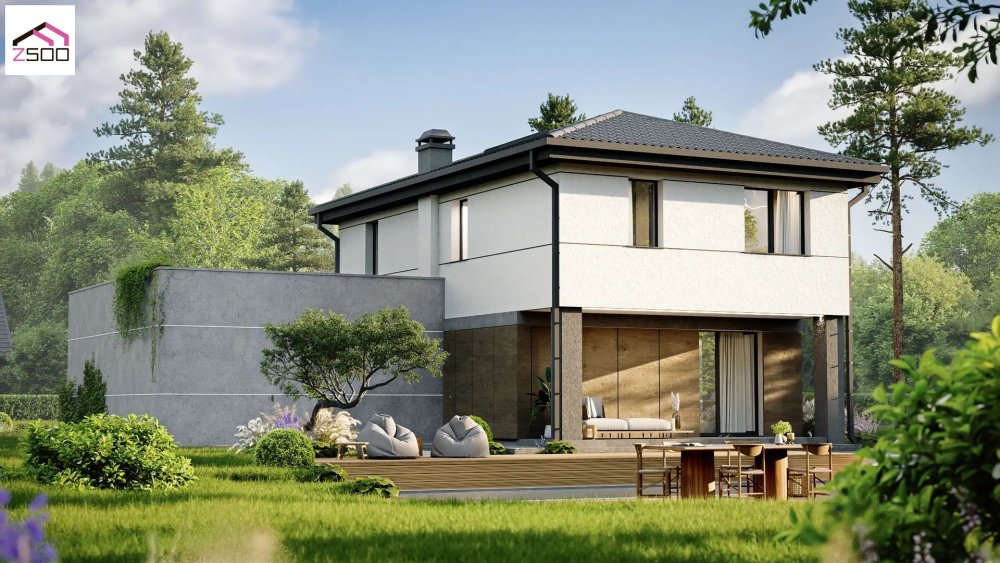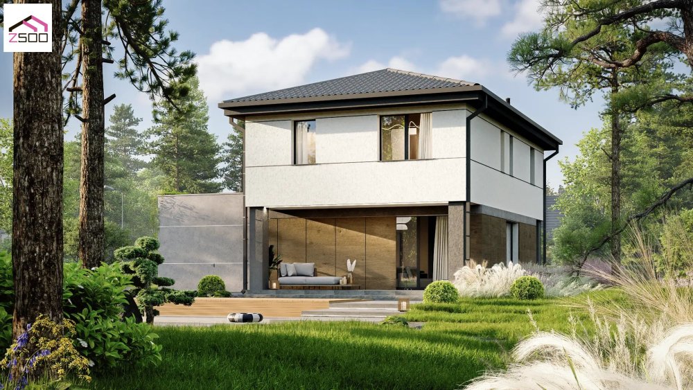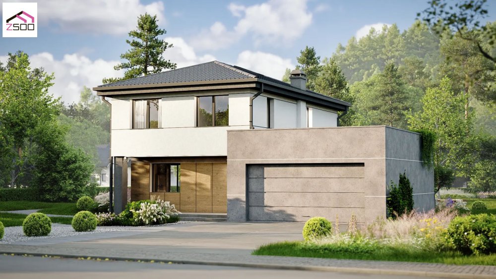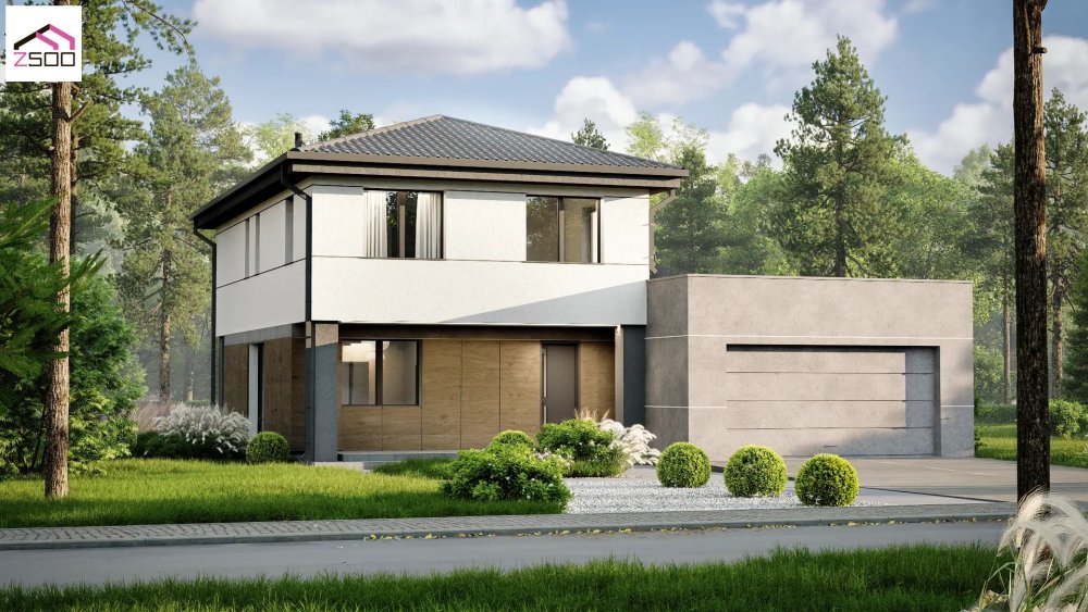 Проєкт двоповерхового будинку для комфортного сімейного життя за містом. Архітектурна концепція будівлі побудована на грі об'ємів, стильних контрастах та поєднанні строгих геометричних форм із затишними природними текстурами. Світле, лаконічне штукатурне оздоблення другого поверху гармонійно доповнюється теплими фасадними панелями з імітацією дерева на першому рівні. Особливим архітектурним акцентом виступає масивний прибудований блок гаража з плоским дахом, виконаний у фактурі світло-сірого архітектурного бетону, що додає екстер'єру легкого урбаністичного шарму. Темний вальмовий дах, графітові віконні рами та системи водовідведення чітко окреслюють контури будівлі та підкреслюють преміальність дизайну. Проєкт відзначається високою функціональністю: місткий гараж органічно інтегрований у загальний ансамбль, а вхідна група та фасадна частина першого поверху надійно захищені нависаючим об'ємом другого рівня. З боку заднього двору спроєктована затишна тераса, заглиблена під перекриття, яка створює ідеальну лаунж-зону для відпочинку на свіжому повітрі за будь-якої погоди. Завдяки великим вікнам та панорамним скляним дверям внутрішній простір будинку візуально об'єднується з навколишнім ландшафтом, наповнюючи кімнати природним світлом.