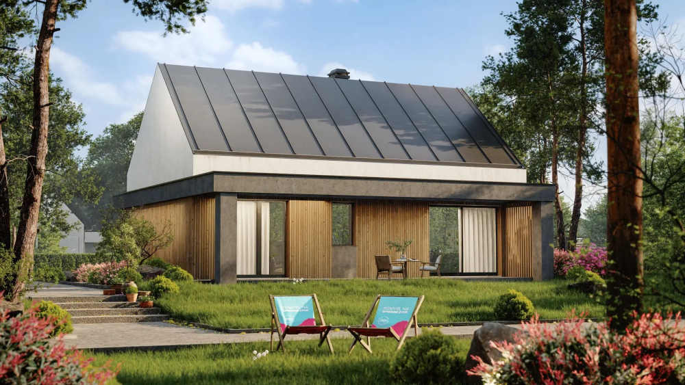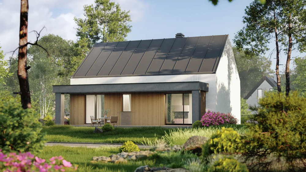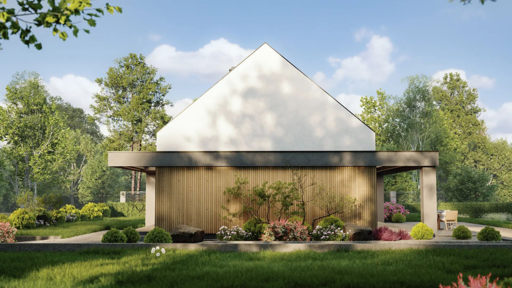 Сучасний котедж, виконаний у мінімалістичному стилі. Будинок має високий двосхилий дах, покритий темно-сірою фальцевою покрівлею. Фасади поєднують світлу штукатурку з обробкою вертикальними дерев'яними панелями теплого відтінку. Ключовий архітектурний акцент — це глибока, крита навісом ніша-тераса, яка візуально розширює простір вітальні назовні завдяки великим площам панорамного скління.