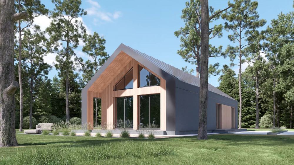 U578 - сучасний одноповерховий будинок у стилі barn house, що поєднує мінімалізм форм, сучасний дизайн і затишок заміської архітектури. Лаконічні фасади, висока двосхила покрівля, панорамні вікна та натуральні матеріали створюють стильний образ, який гармонійно виглядає як у передмісті, так і за містом.