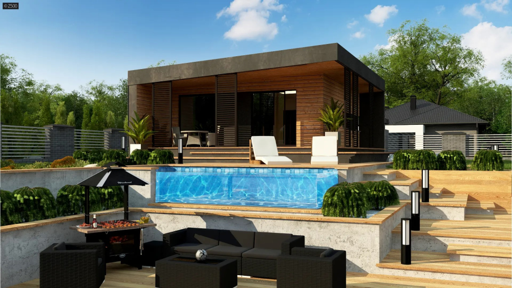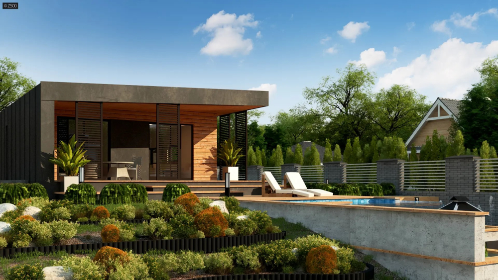 Невелика загальна площа робить будинок зручним у догляді й утриманні, що зменшує експлуатаційні витрати. Сучасний зовнішній вигляд із дерев’яним облицюванням, металевими елементами та скляними вставками надає будинку естетичної привабливості й гармонійно вписує його в будь-яке оточення.