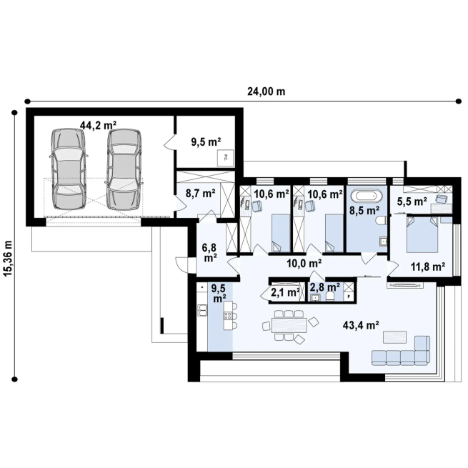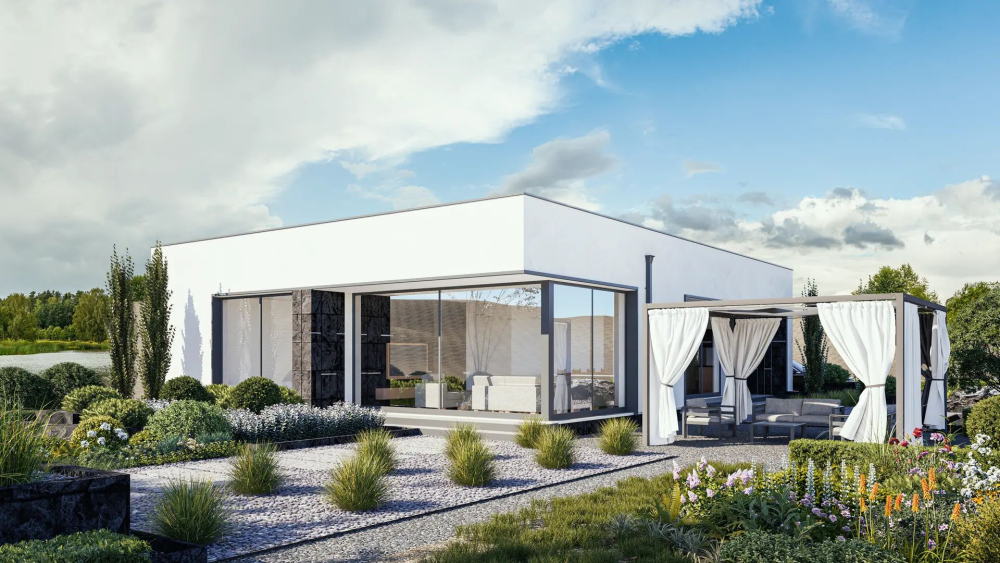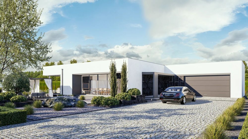 Сучасний одноповерховий будинок з пласким дахом та чіткими геометричними формами. Фасад має стильний вигляд завдяки контрастному поєднанням білого та сірого кольорів.
