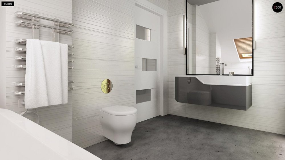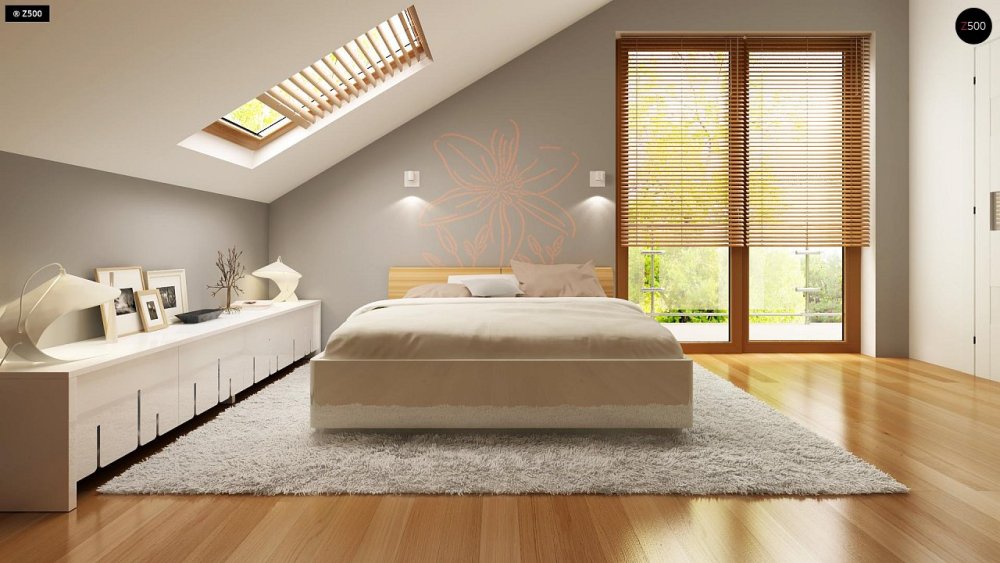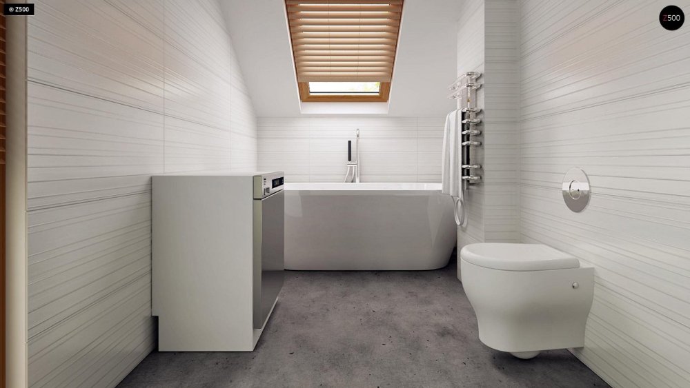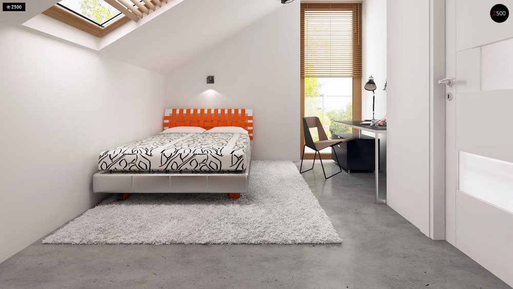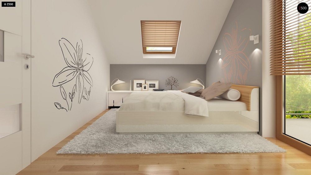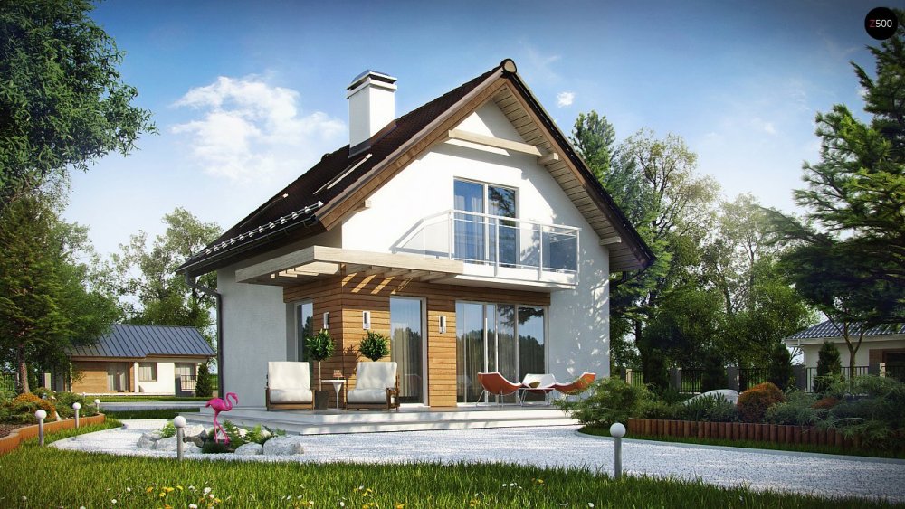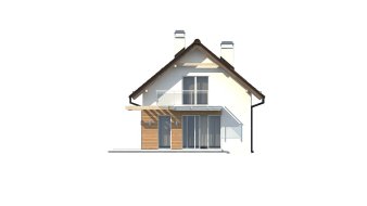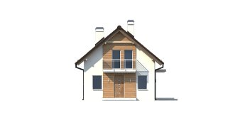 Проєкт будинку з мансардним другим поверхом і двосхилим дахом. Компактна, проста форма збагачена дерев'яним оздобленням фасаду надає будівлі цікавий і сучасний вигляд.