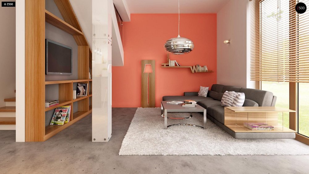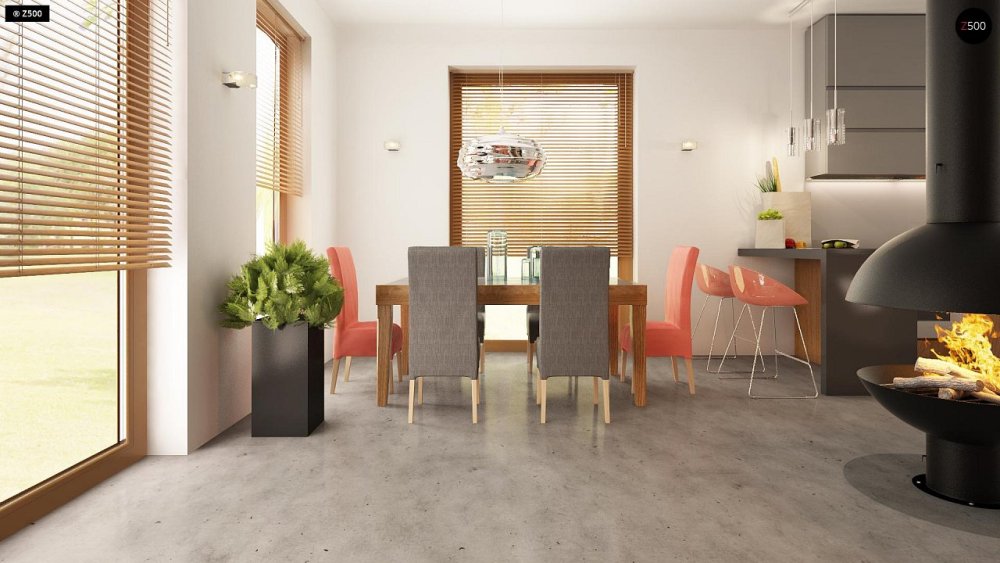 На першому поверсі розташована денна зона, до якої входить вітальня з каміном і виходом на терасу, їдальня об’єднана з вітальнею та велика кухня, а також передпокій з великою шафою і невелика ванна кімната. На другому поверсі запланована ванна кімната і дві великі, зручні спальні, одна з яких має власний гардероб, а інший вихід на балкон.