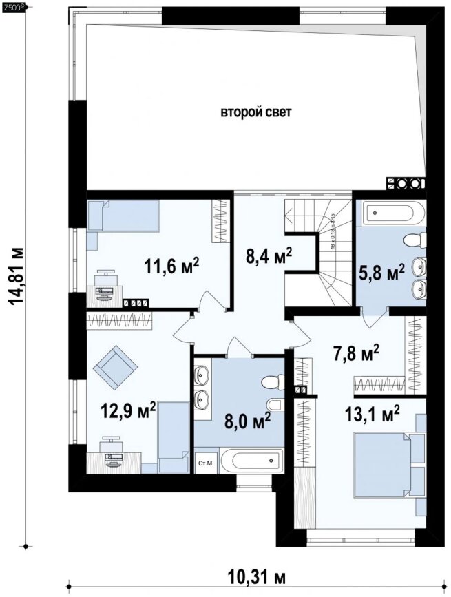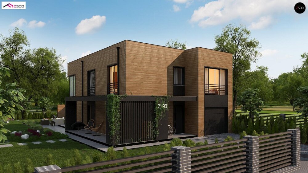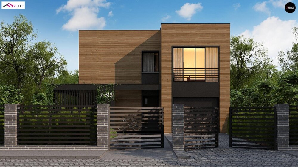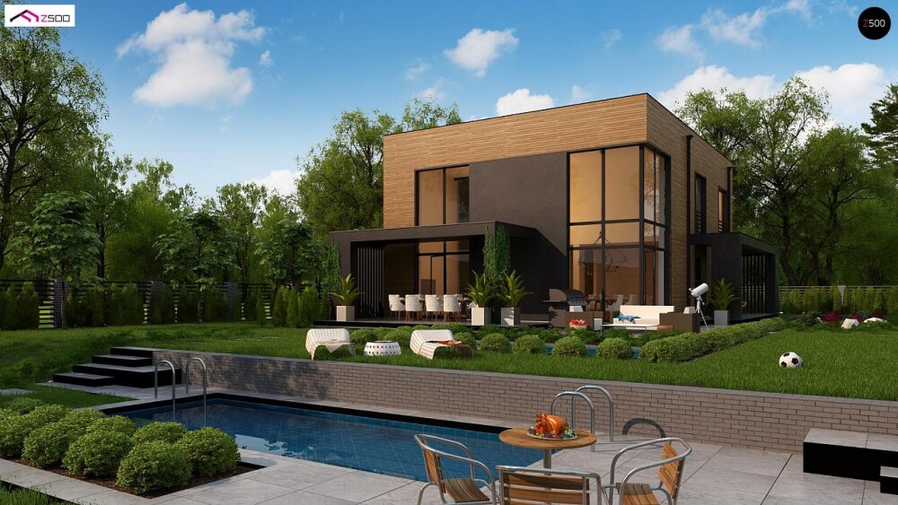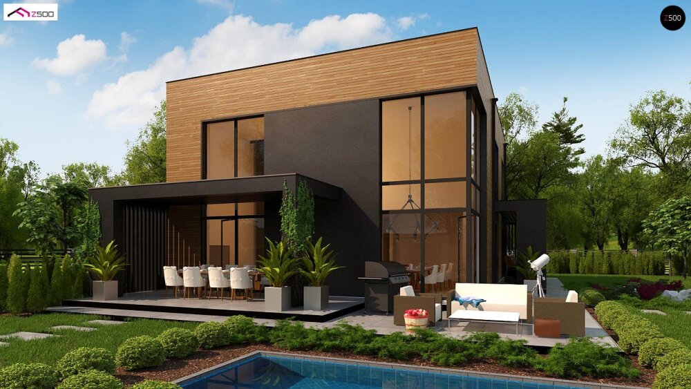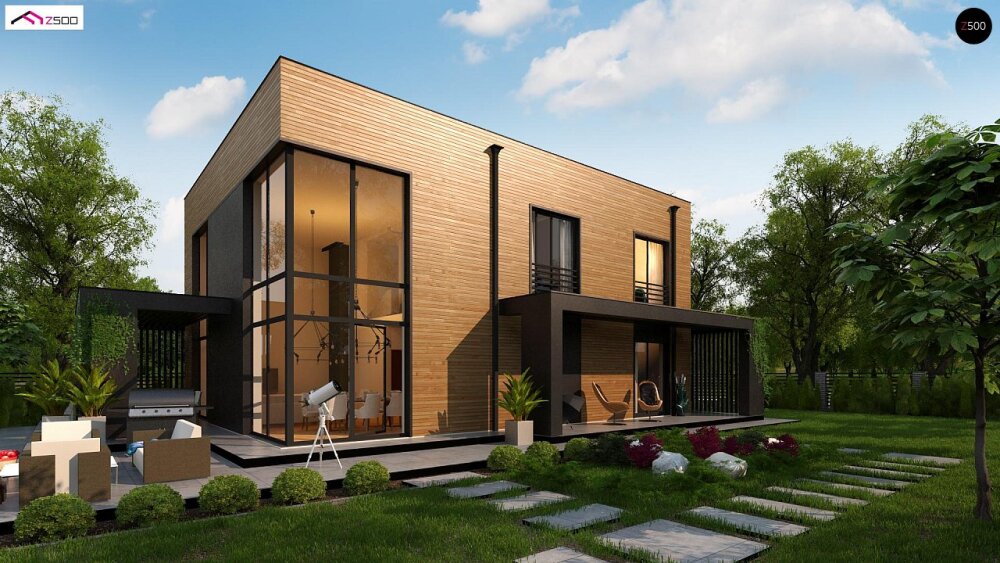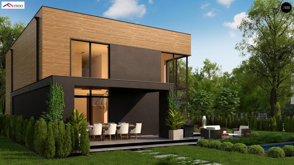 Стильный проект двухэтажного дома с плоской кровлей, вторым светом и панорамными окнами.